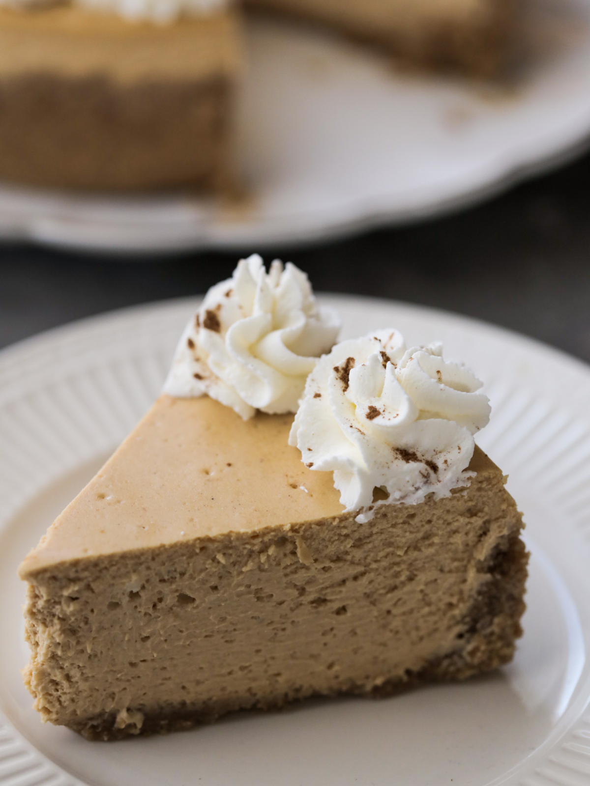 My favorite dessert at the Thanksgiving dessert table is pumpkin-flavored anything. But this cheesecake wins first place! It’s rich, creamy, and absolutely heavenly. I made a homemade whipped cream topping to adorn the top of it with, and it turned out so FANTASTIC!